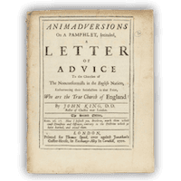 A pamphlet by English clergyman John King, the rector of Chelsea in London. It heavily criticized a pamphlet by Cotton Mather titled, A letter of advice to the churches of the non-conformists in the English nation. In his pamphlet, Mather had critiqued the Church of England, feeling that the nonconformists, predecessors of New England’s puritans, represented the “true” church.
