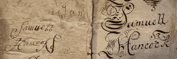 The wider Hancock family also contributed to religious activity in Massachusetts. Recently, the Congregational Library & Archives acquired a fascinating pamphlet from 1716, Two Discourses Shewing, I. That the Lords Ears are Open to the Prayers of the Righteous… by Increase Mather. On the first page in elegant script from 1722, Samuel Hancock notes that the pamphlet was “presents by” Mr. Increase Mather.” According to American Ancestors, though Samuel Hancock (1672/3 – 1735) did not serve as a minister like his brother John did in Lexington, he was baptized as an adult and was admitted as a member to the Lexington Congregational church. Approximately a year later, Samuel Hancock returned to Cambridge, and at some point, he served as a Deacon.