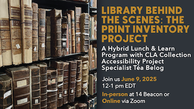 In this hybrid lunch and learn program, Collection Accessibility Project Specialist Téa Belog discussed her work on the inventory of the CLA’s print collection, which is part of a two-year initiative launched in January 2025 under the guidance of Librarian Meaghan Wright to complete an inventory for the entire print collection.