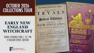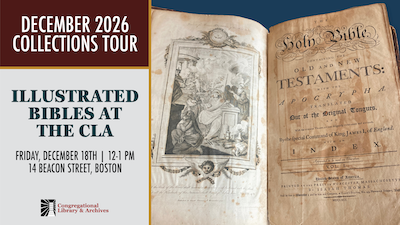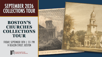 The Congregational Library & Archives fosters a deeper understanding of the Congregational story and its ongoing relevance to contemporary society by collecting, preserving, and sharing materials and resources and by engaging faith communities, students, scholars, and the general public.